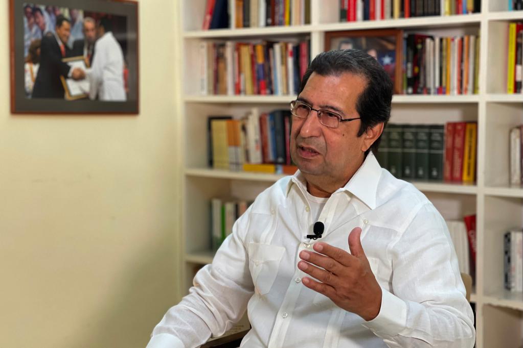 4月1日,委內(nèi)瑞拉統(tǒng)一社會主義黨副主席、委內(nèi)瑞拉駐古巴大使阿丹·查韋斯在古巴首都哈瓦那接受采訪。新華社發(fā)(委內(nèi)瑞拉駐古巴使館供圖)