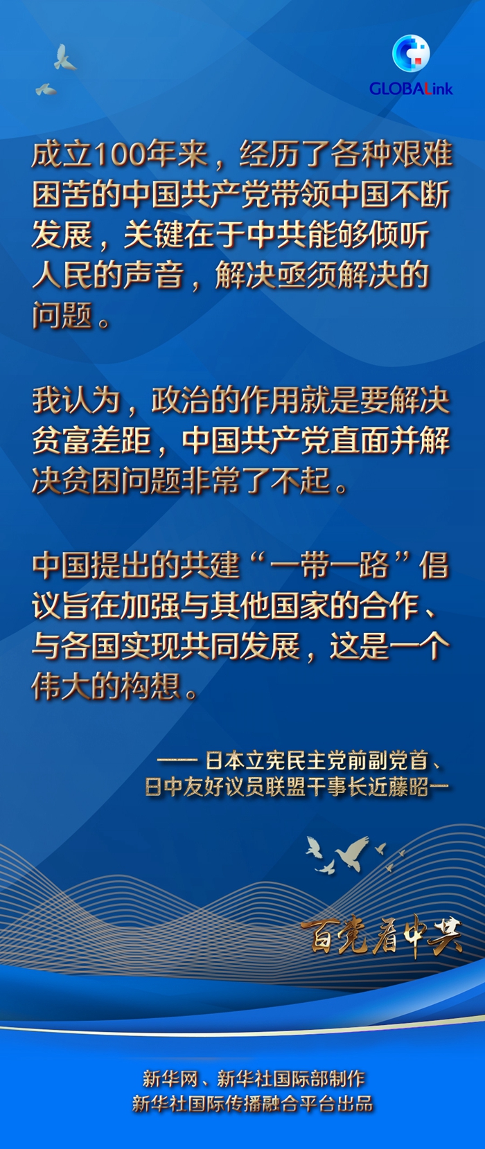 1996年首次當選日本國會眾議員至今,近藤訪華70余次,見證了中國發(fā)生的巨大變化。從政以來,他越來越深刻地感受到,“中國共產(chǎn)黨的宗旨是為人民服務(wù),中國的發(fā)展是在中國共產(chǎn)黨的領(lǐng)導(dǎo)下實現(xiàn)的”。