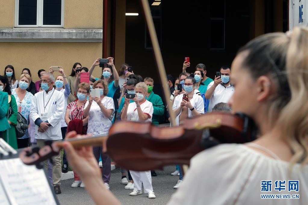 當(dāng)日,羅馬尼亞首都布加勒斯特一個樂隊在該國一家傳染病醫(yī)院——馬太·巴爾什醫(yī)院演出,向抗擊新冠疫情的醫(yī)務(wù)工作者致謝。