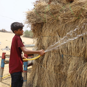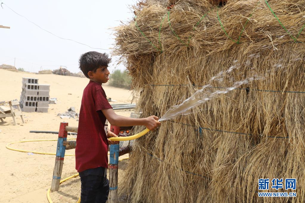 6月17日,一名男孩在也門北部哈杰省的一座難民營(yíng)內(nèi)給自家的茅草屋澆水降溫。