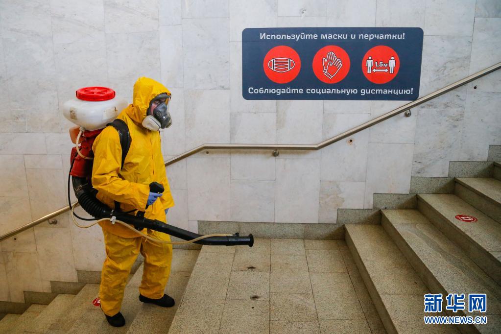6月24日,工作人員身著防護(hù)服在俄羅斯莫斯科一個(gè)火車站進(jìn)行消毒作業(yè)。