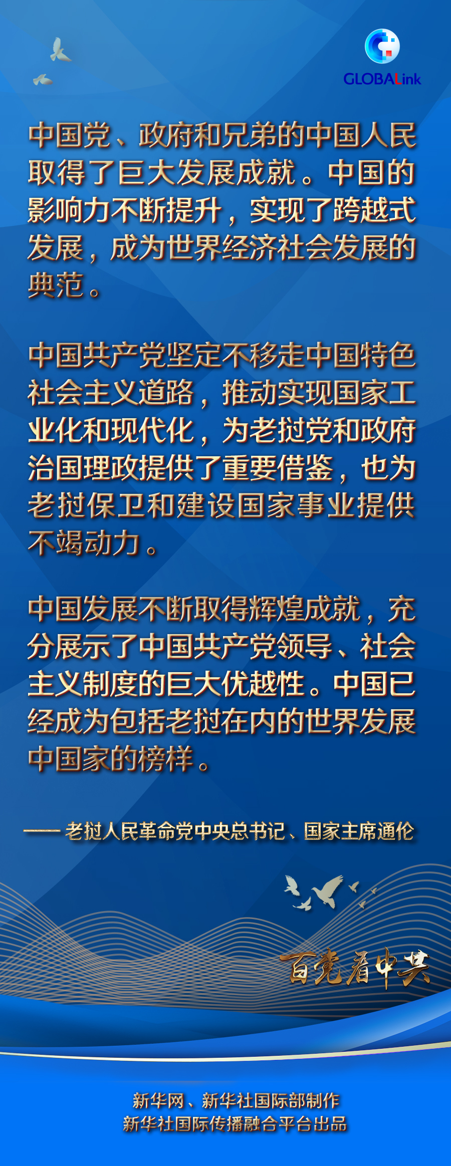 “老撾黨、政府、人民高興地看到,中國黨、政府和兄弟的中國人民取得了巨大發(fā)展成就。中國的影響力不斷提升,實現(xiàn)了跨越式發(fā)展,成為世界經(jīng)濟社會發(fā)展的典范?!蓖▊愓f:“中國共產(chǎn)黨堅定不移走中國特色社會主義道路,推動實現(xiàn)國家工業(yè)化和現(xiàn)代化,為老撾黨和政府治國理政提供了重要借鑒,也為老撾保衛(wèi)和建設(shè)國家事業(yè)提供不竭動力。”