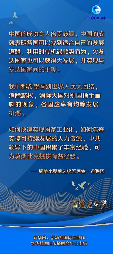 希薩諾列舉了莫中兩國在經(jīng)貿(mào)、基礎(chǔ)設(shè)施建設(shè)、科技、農(nóng)業(yè)和制造業(yè)等領(lǐng)域合作取得的成果。他說,如何快速實現(xiàn)國家工業(yè)化,如何培養(yǎng)支撐可持續(xù)發(fā)展的人力資源,中共領(lǐng)導(dǎo)下的中國積累了豐富經(jīng)驗,可為莫桑比克提供有益經(jīng)驗。(編輯:邵杰、陳俊鋒、王昭、齊紫劍、商婧、馬震、周良、丁瑩、梁毅、朱夢娜、錢泳文;海報設(shè)計:楊霽昕)